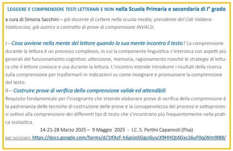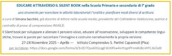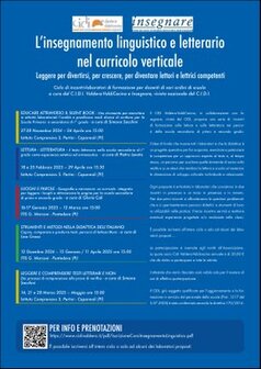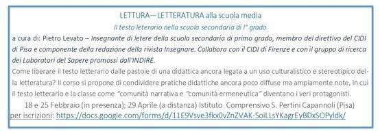 INCONTRI ONLINE PER L'INSEGNAMENTO LINGUISTICO Lina Grossi - M.Gloria Calì Il CIDI Valdera-Valdicecina in collaborazione con Insegnare, rivista del CIDI, propone due incontri di formazione sulla lettura e sulla letteratura nei percorsi della scuola secondaria di primo e secondo grado. L’idea di fondo è che un progetto didattico operativo debba far acquisire, esercitare e potenziare un approccio esperto al testo perché la lettura allo stesso tempo diventi strumento di sviluppo culturale individuale e relazionale. La proposta consiste in 2 incontri-laboratorio in cui le due formatrici, Lina Grossi e M. Gloria Calì proporranno percorsi didattici e strumenti di lavoro utilizzabili nella pratica. Gli incontri, della durata di due ore ciascuno, si svolgeranno online e In ognuno saranno presenti entrambe le relatrici che si alterneranno nelle presentazioni. | |||